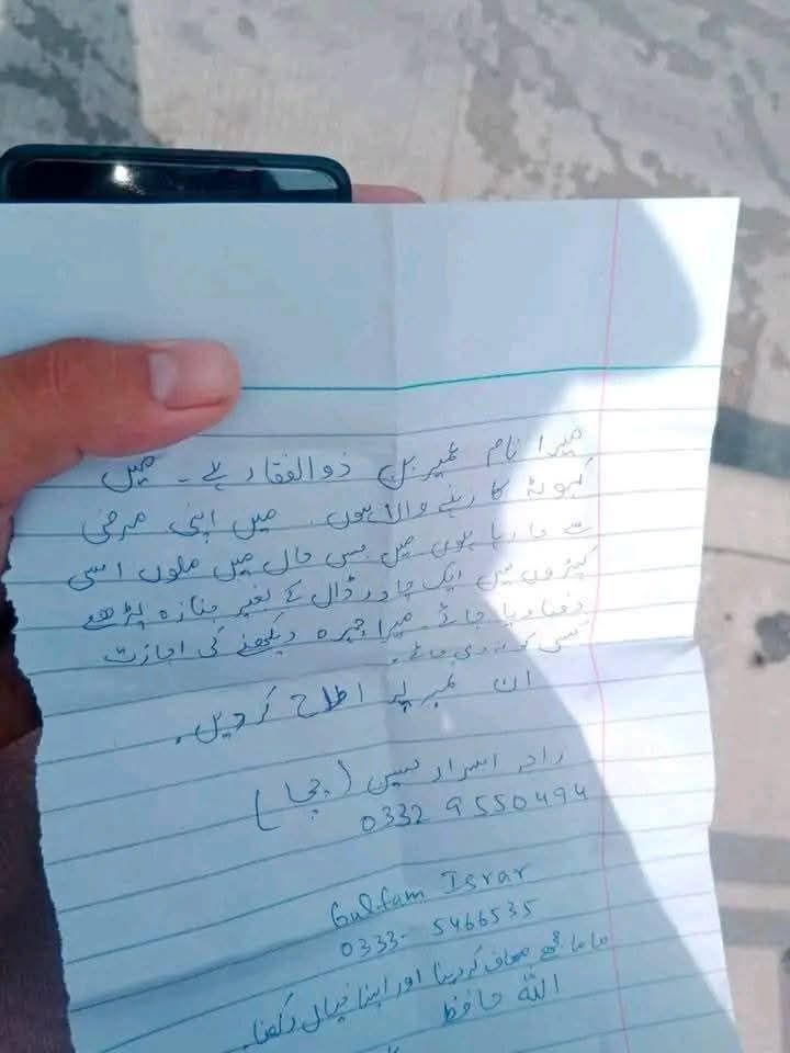میں اپنی زندگی سے تنگ آ کر خودکشی کر رہا ہوں۔ میری وصیت ہے کہ مجھے بنا نماز جنازہ دفنایا جائے۔ میرا چہرہ دیکھنے کی اجازت کسی کو نہ دی جائے۔ میری زندگی میں کسی نے میری مدد نہیں کی، مرنے کے بعد بھی کوئی احسان نہ کرے۔
